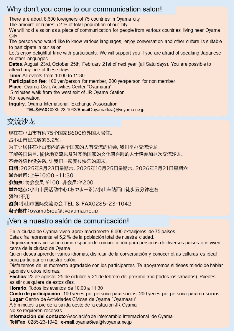 現在、小山市には約75か国の外国人が8600人ほど住んでいます。