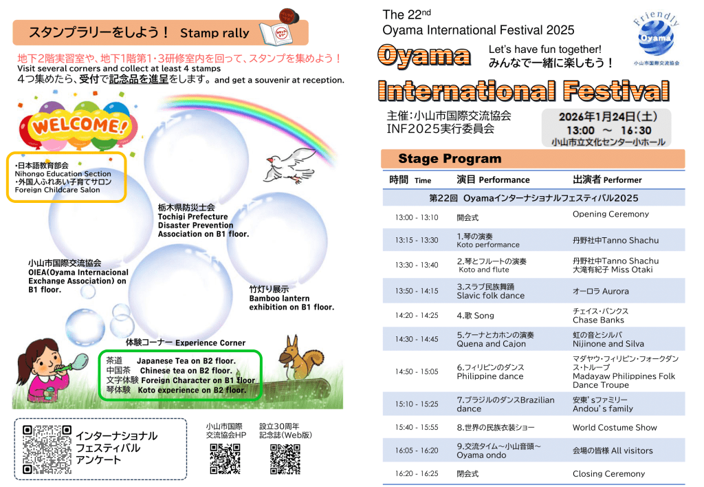 小山市国際交流協会では、今年もインターナショナルフェスティバル2025を開催いたします。そこで、ステージプログラム、体験コーナー等をお手伝いいただける方を募集しています!皆様のご協力をお待ちしております。