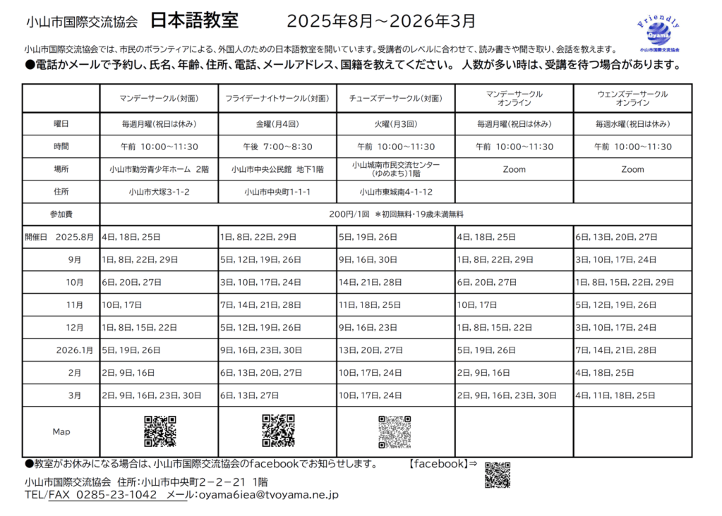 日本語教室カレンダー